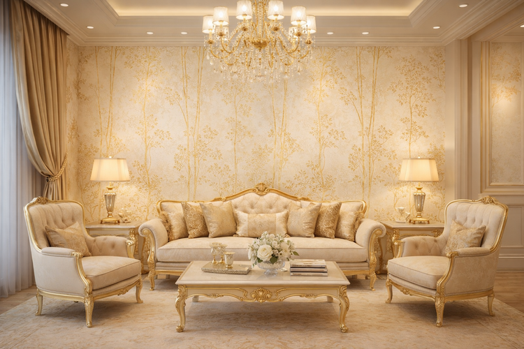 این طرح خیلی شیکه… زمینه کرم با نقش درختهای طلایی ظریف، کاملاً حس لوکس ملایم و کلاسیک مدرن میده 👌